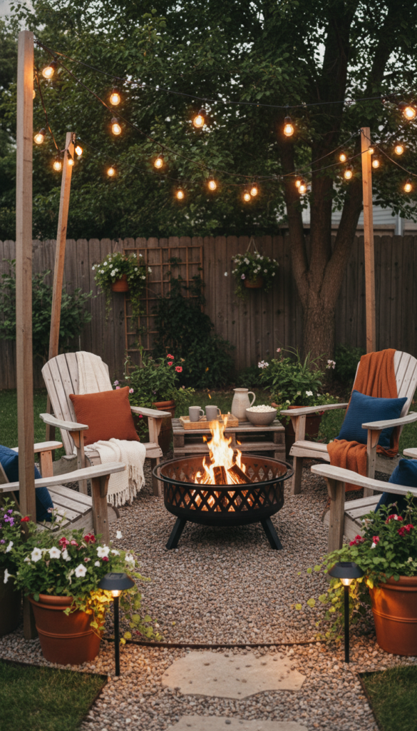 Use a portable metal fire pit or a simple stone ring. Surround it with mismatched chairs for a relaxed feel. Keep it casual, not campground themed.