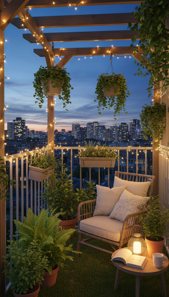 String lights are the cheat code of balcony garden decor. They instantly soften hard railings and concrete walls and make even the smallest space feel inviting. Warm white lights work best because they mimic sunset vibes and flatter everything from plants to furniture.