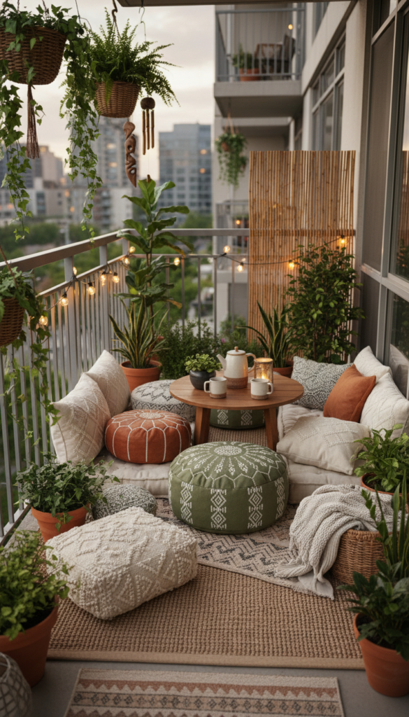 Low seating is having a moment in patio decor trends. Floor cushions, poufs, or low benches make balconies feel casual and cozy. This setup works especially well for evening tea or reading sessions.