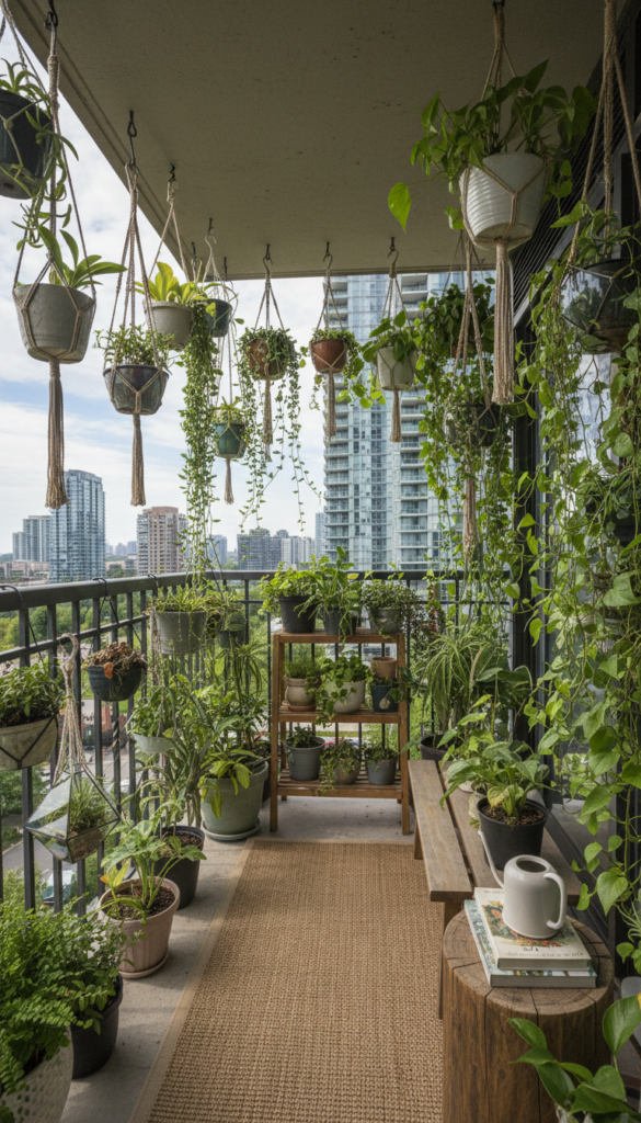 Hanging plants bring drama without crowding the floor. Ferns, pothos, and spider plants are easy choices and thrive in balcony conditions. Suspended greenery adds depth and movement to the space.