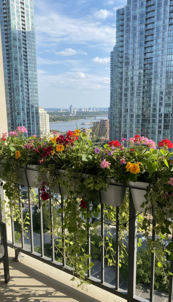 Balcony railings are prime real estate that often gets ignored. Rail planters add greenery without taking up floor space and create a lush border effect. Flowers, trailing vines, or even herbs work beautifully here.
