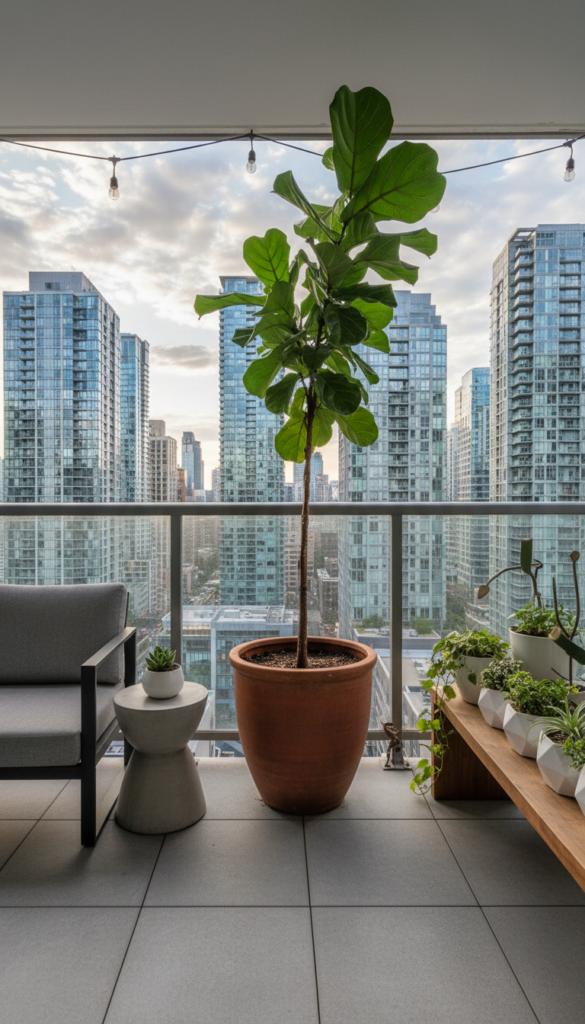 Sometimes all you need is one plant that steals the show. A large fiddle leaf, palm, or rubber plant can anchor the balcony and define the layout. This works especially well in minimalist setups.