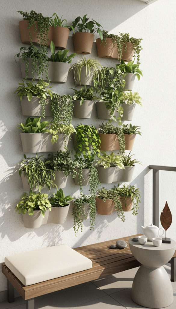 When floor space is limited, walls become your best friend. Vertical gardens are trending hard in small garden decor because they add greenery without cluttering the balcony floor. Think wall mounted planters, hanging pockets, or simple shelves with trailing plants.
