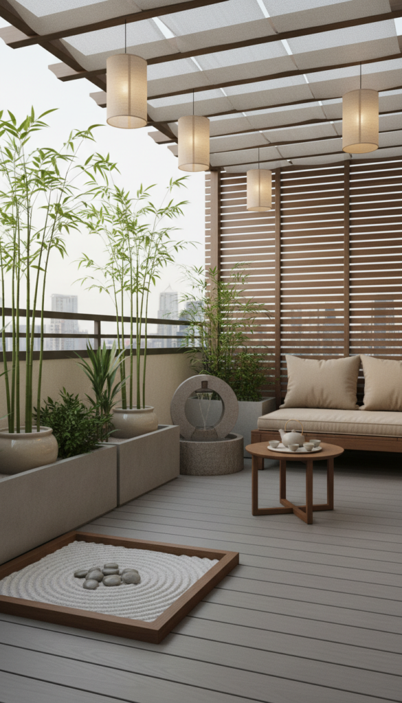 If chaos lives inside, let calm live outside. Zen style balcony gardens focus on minimalism, balance, and calming elements. Think simple planters, bamboo accents, and a limited color palette.