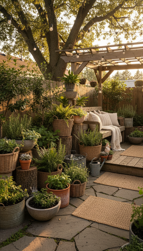 Matching planters are fine, but mixing them feels more personal. Different heights, textures, and materials make garden decor ideas feel layered and lived in.