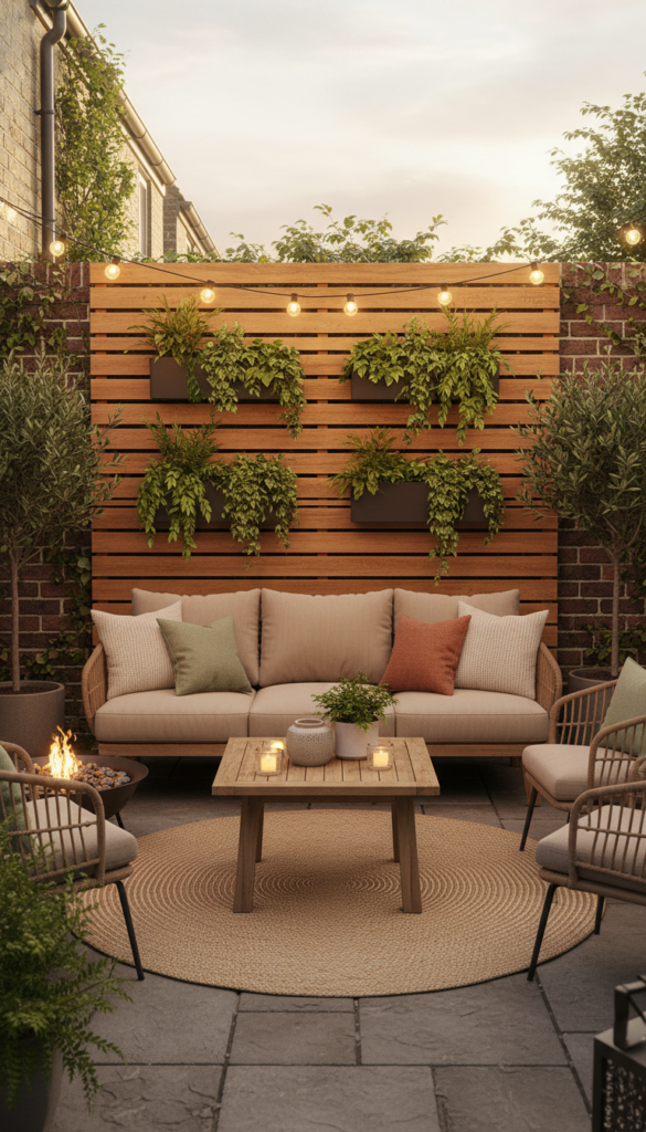 Privacy doesn’t have to look like a fence. Screens made from wood slats, plants, or fabric add style while creating intimacy.