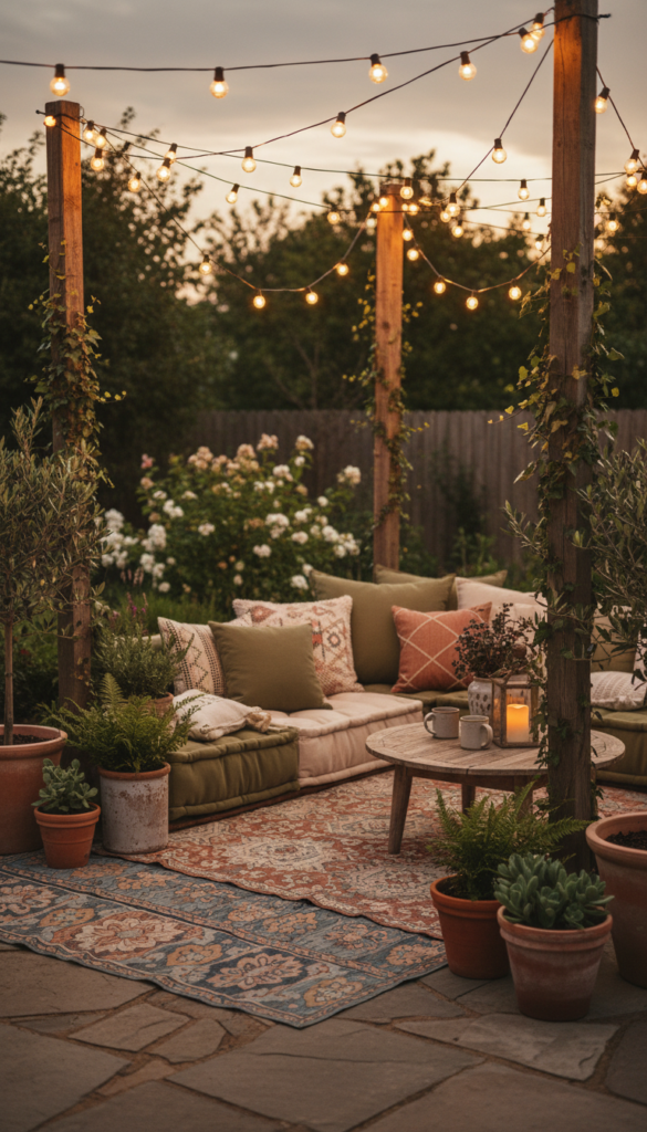 I love wrapping warm lights around trees, fences, or even a simple DIY post setup. Add a couple of outdoor cushions and a textured rug, and suddenly it feels like a secret lounge. Warm white bulbs always win because harsh lighting kills the vibe fast.