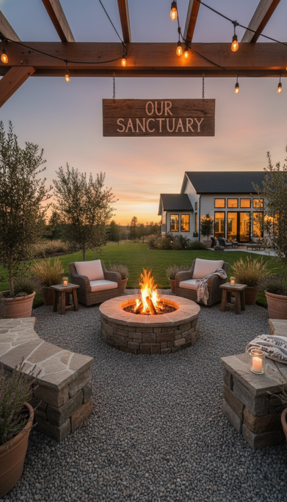 Use pavers or stones to create a circle and keep seating casual. I prefer gravel underfoot because grass gets destroyed fast. Low chairs keep the setup relaxed.