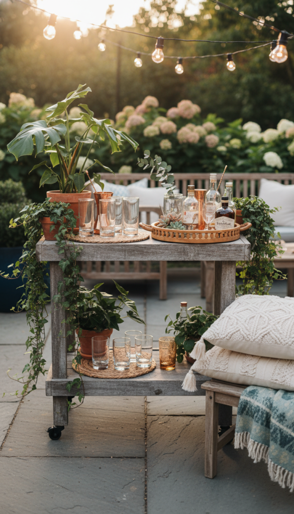 Use a weather friendly cart and style it with plants, trays, and simple glassware. Keep it flexible so it can move where the party goes. Less clutter keeps it classy.