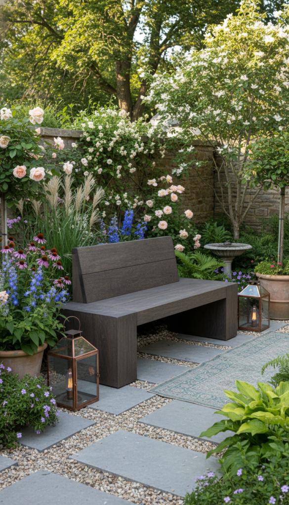 Choose wood or metal with clean lines and let plants frame it. I like benches tucked into corners or along paths. One strong piece beats many small ones.