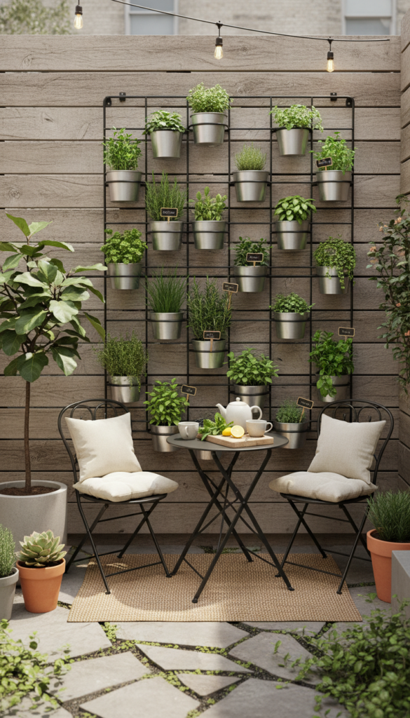 Use wall planters, pocket fabric panels, or mounted pots. Keep it near the kitchen if possible for easy snipping. Mixing herbs with trailing plants adds softness.