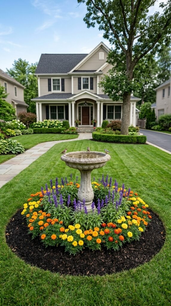 Surround it with a low ring of colorful blooms like petunias, marigolds, or dwarf salvia. Keep the flowers tight and symmetrical so the bird bath feels intentional, not lost. Add dark mulch to make the colors pop.