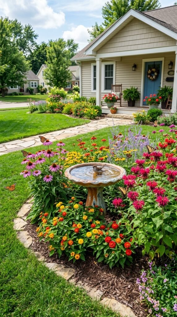 Use a mix of heights to create layers. Taller blooms at the back, shorter flowers near the front. The bird bath becomes part of a lively mini ecosystem.