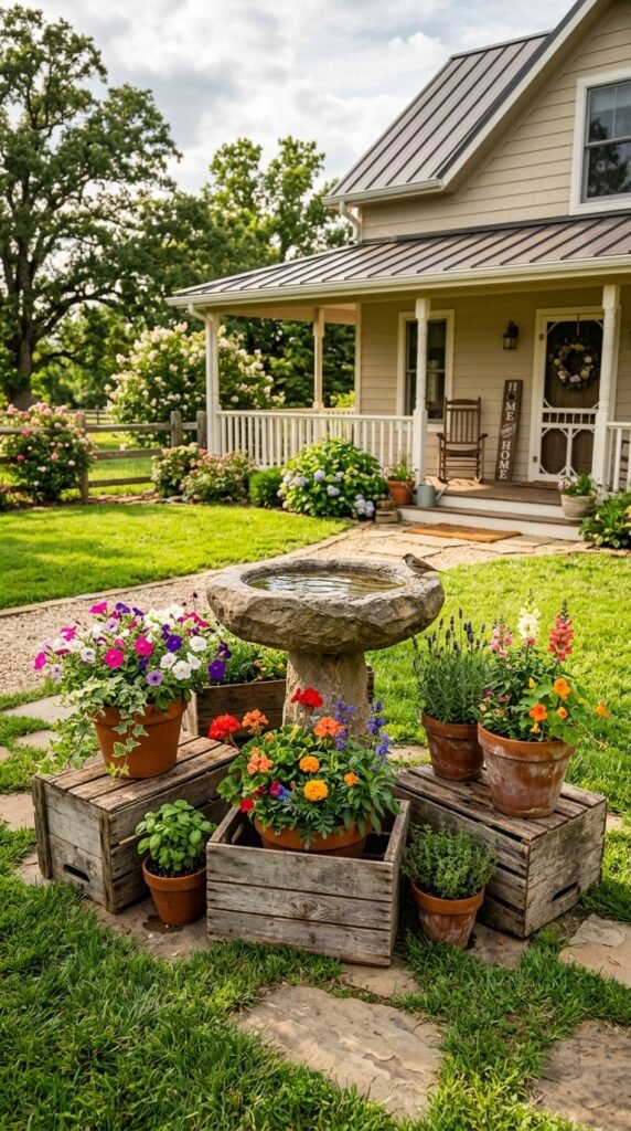 This setup feels soft and inviting. Birds love the layered plants. Homeowners love the dreamy aesthetic. It is one of those outdoor decor ideas that looks Pinterest ready without overthinking it.