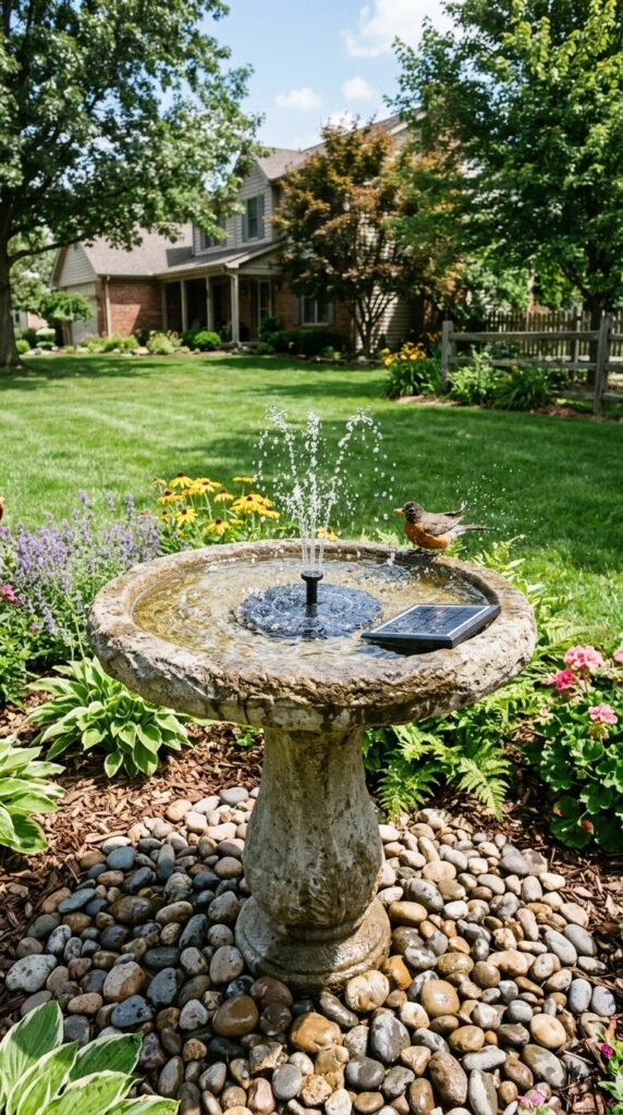 In spring, add pastel flowers. In fall, place mini pumpkins and ornamental cabbage nearby. In winter, wrap the base with evergreen branches. Keep the bird bath itself clean and functional.