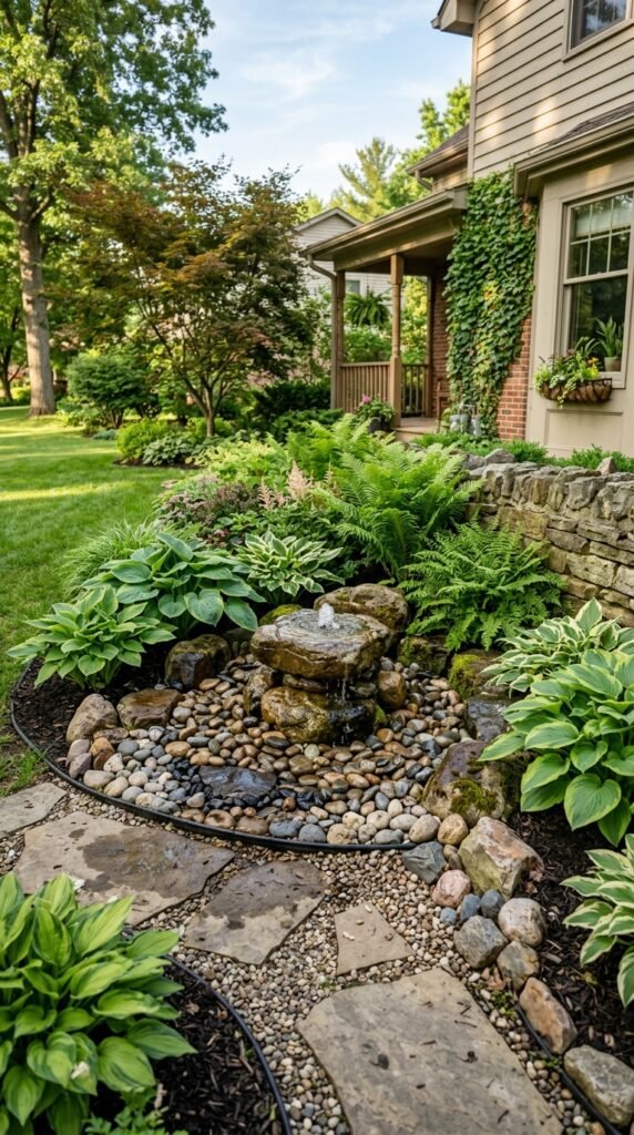 Place a compact stone fountain in the corner and surround it with greenery or pebbles. Add low plants like hostas or ferns around the base.