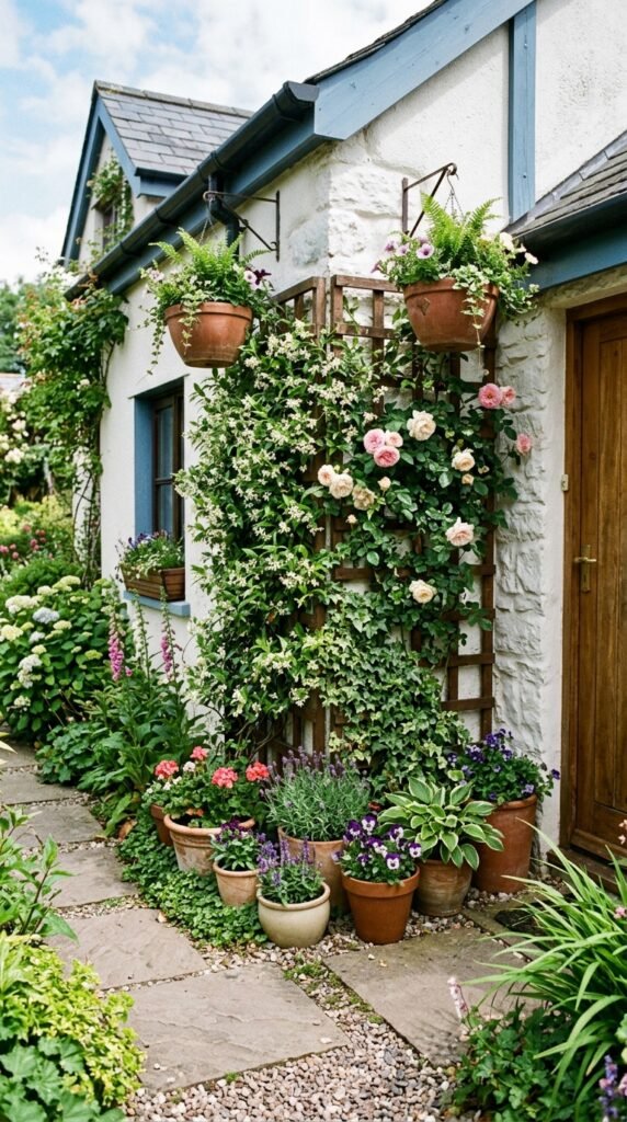 Install a wooden or metal trellis in the corner and grow climbing plants like jasmine, ivy, or roses. The greenery climbs upward and turns the wall into a living backdrop.