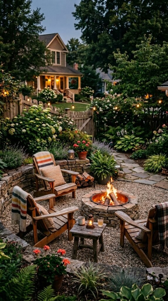 Place a compact stone fire pit with two or three outdoor chairs and surround it with plants or gravel. The space instantly becomes a social spot.
