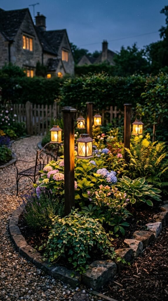 Hang solar lanterns or small string lights around the corner and place a few plants beneath them. The soft glow makes the garden feel magical at night.