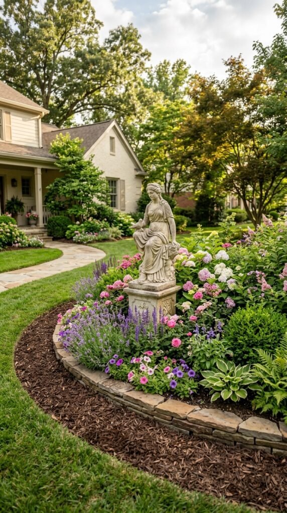 Choose stone statues, bird baths, or decorative sculptures and place them in the center of a small flower bed. Surround them with low greenery to highlight the feature.