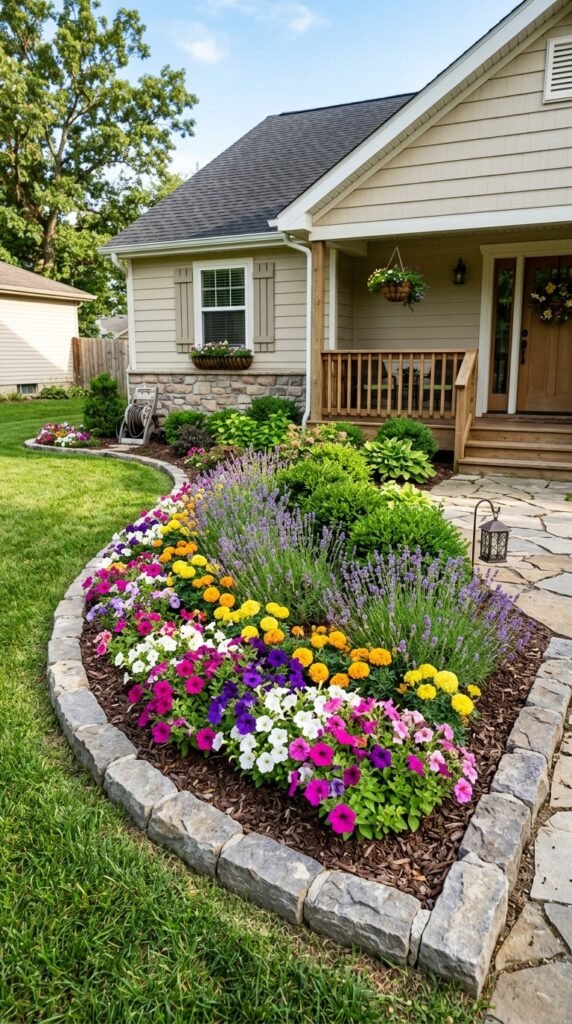 Mix colorful blooms like petunias, marigolds, and lavender with medium shrubs for depth. Adding dark mulch or decorative stones around the bed makes the flowers pop even more. It also helps retain moisture and reduces weeds.