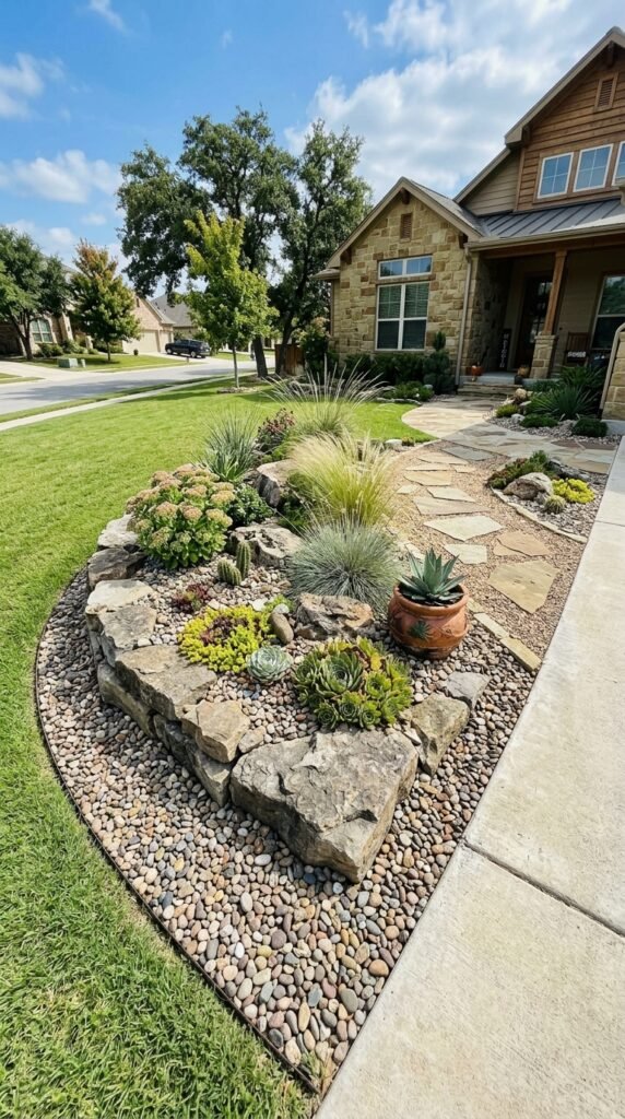 This design adds personality and visual interest without cluttering the space. It is a simple way to elevate front yard garden decor.