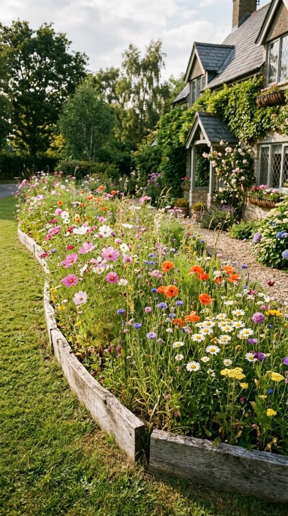 Use cosmos, daisies, poppies, and native wildflowers to create a soft meadow style corner. The look feels colorful, slightly messy, and completely charming.