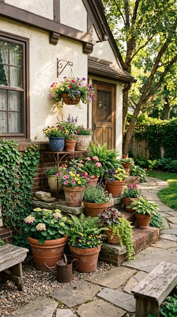 Use terracotta, ceramic, or stone planters and fill them with a mix of flowers, ferns, and leafy plants. Arrange the pots in layers so taller ones sit behind smaller ones.