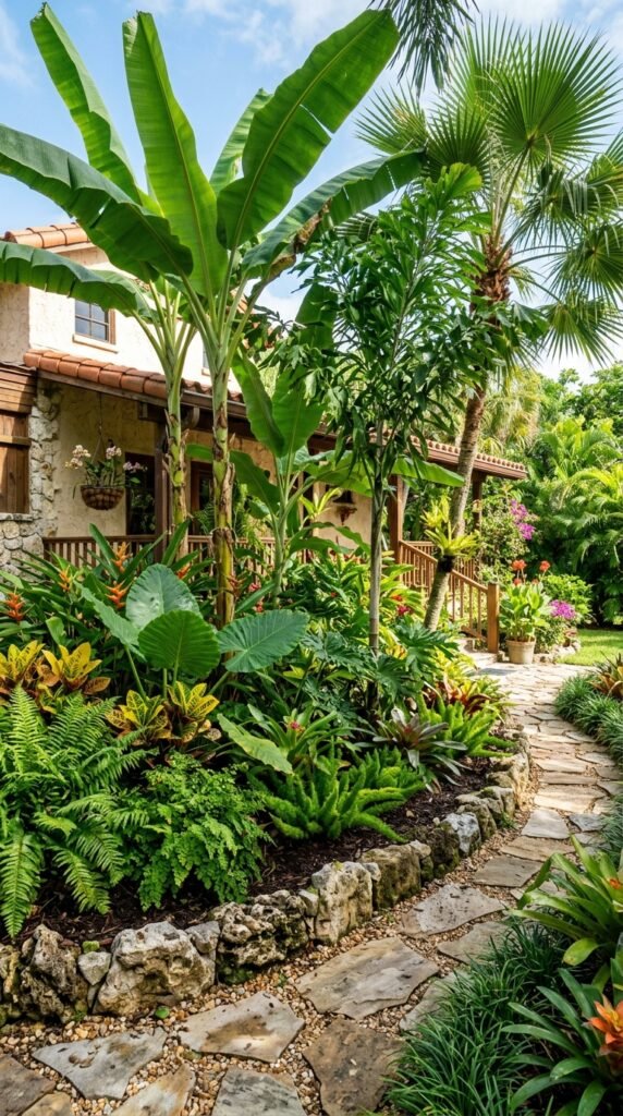 Plant large leafy plants like banana plants, palms, and ferns in a dense arrangement. Add natural wood edging or stones for contrast.