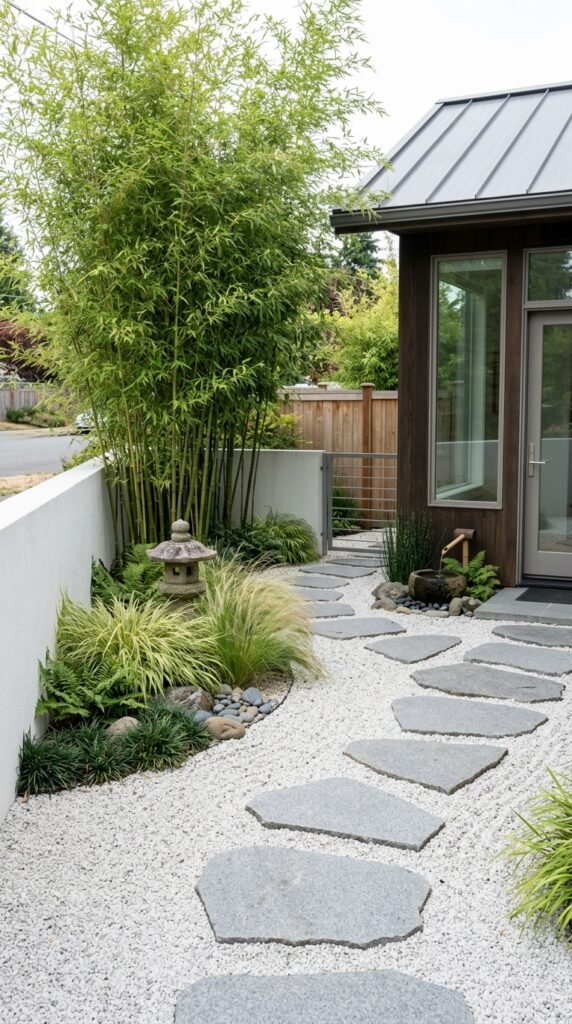 Use fine gravel, stepping stones, and a few sculptural plants like bamboo or ornamental grasses. Keep the color palette simple and natural.