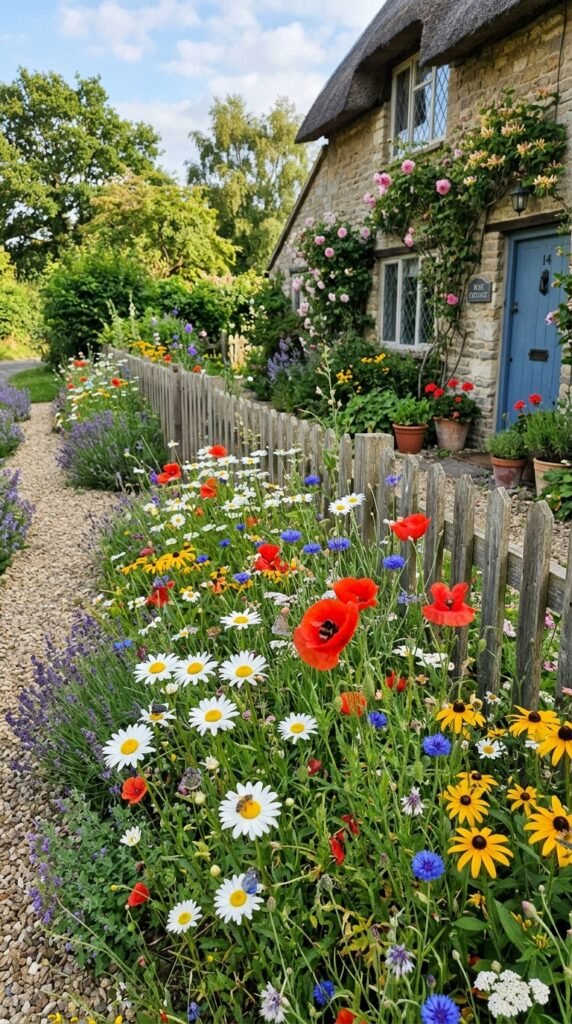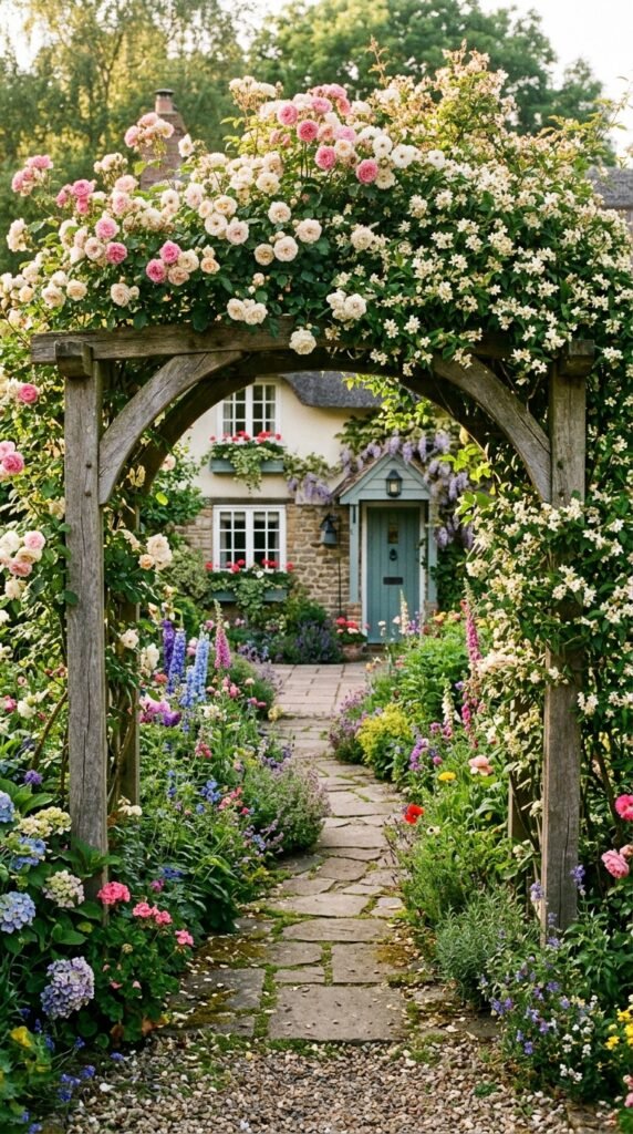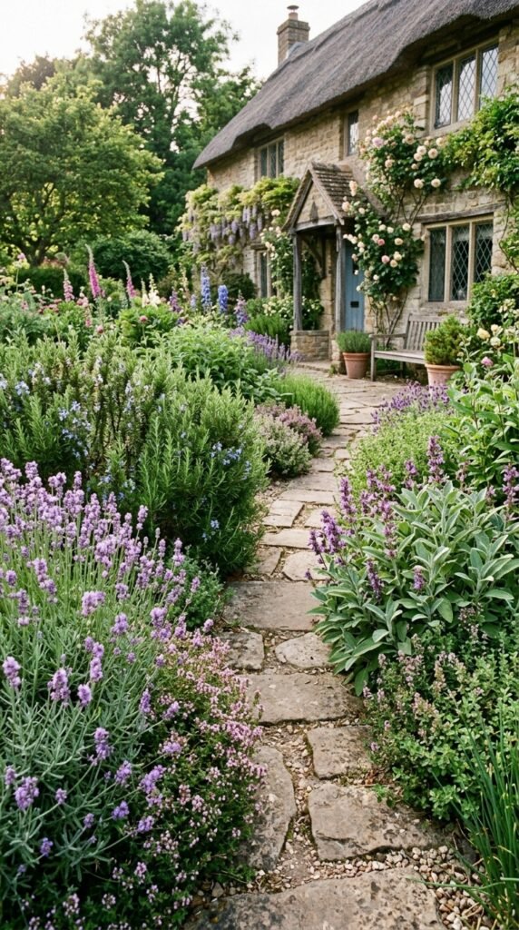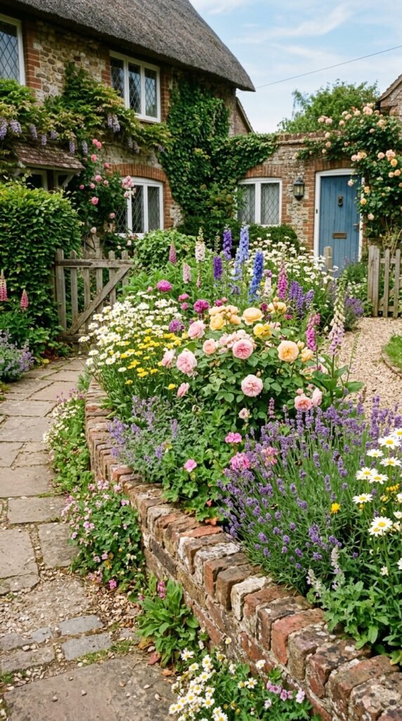 Use irregular stepping stones surrounded by dense flowers like lavender, daisies, and salvia. The goal is that slightly wild look where plants gently spill over the edges. Cottage gardens look best when they feel relaxed and abundant rather than perfectly trimmed.