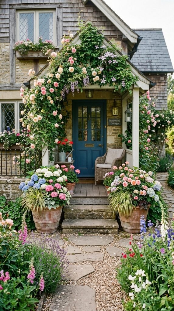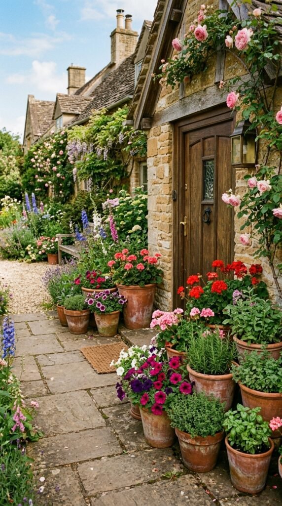 The trick is letting plants spill slightly over the edge. Perfect symmetry looks too formal. Cottage gardens thrive on that relaxed, overflowing feel that makes the whole house look welcoming.