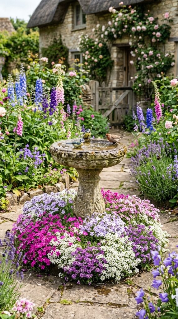 A stone birdbath placed in the middle of a flower bed works perfectly. Surround it with low flowers like alyssum or creeping phlox so the birdbath stands out.