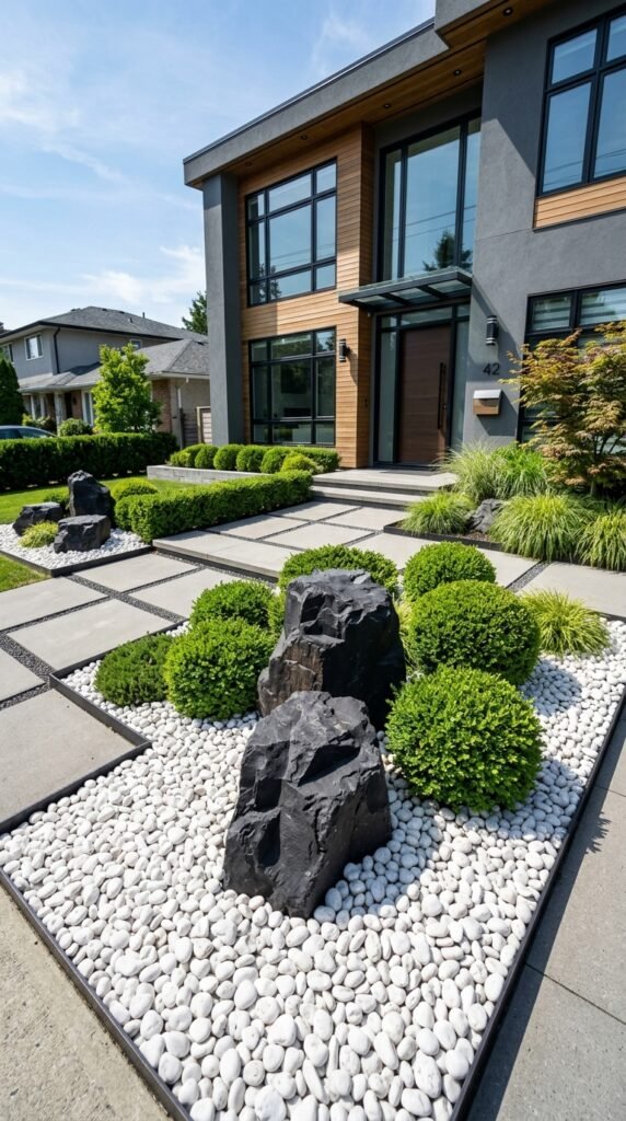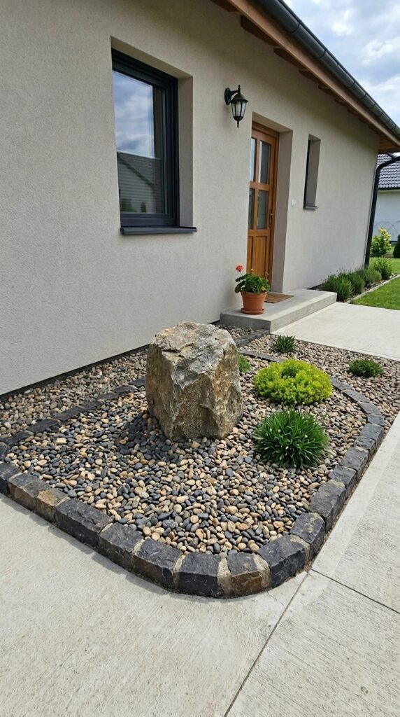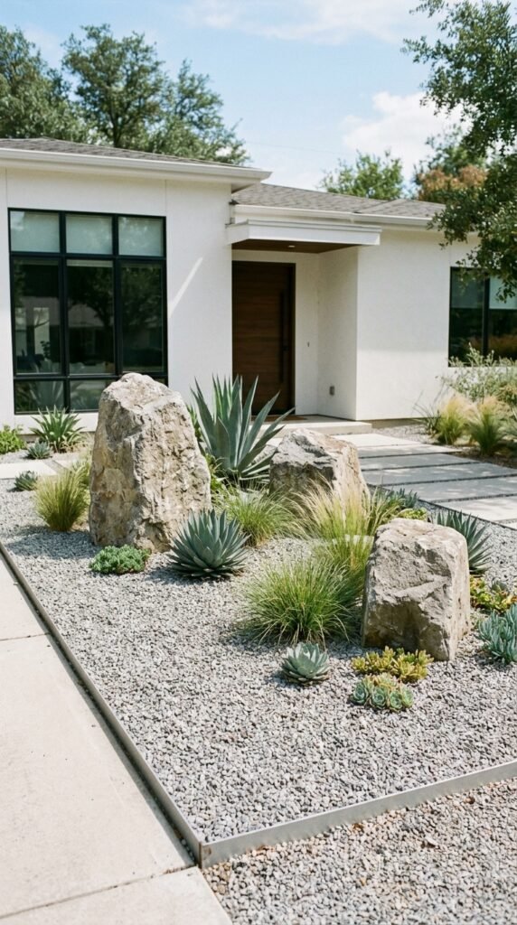 Start with light gray or beige gravel as your base. Add two or three oversized natural boulders as focal points. Plant drought tolerant greenery like agave, yucca, or ornamental grasses between the rocks for contrast. Keep the layout simple and symmetrical. Less clutter, more impact.