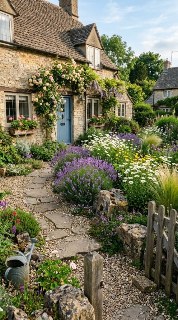 Use natural uneven stones and small gravel patches. Add lavender, daisies, and ornamental grasses spilling around the rocks. Let plants overlap slightly for that relaxed look.