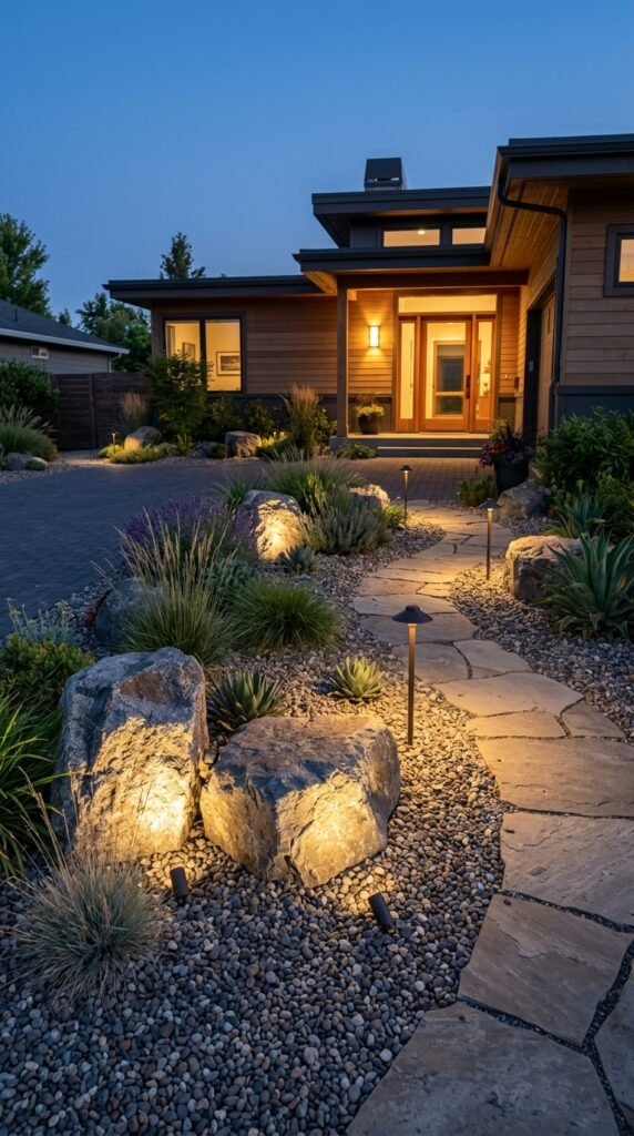 Install subtle ground lights between rocks. Choose warm white lighting to highlight boulders and plants. Place lights near pathways or focal stones for layered brightness. Solar lights make installation easy and budget friendly.