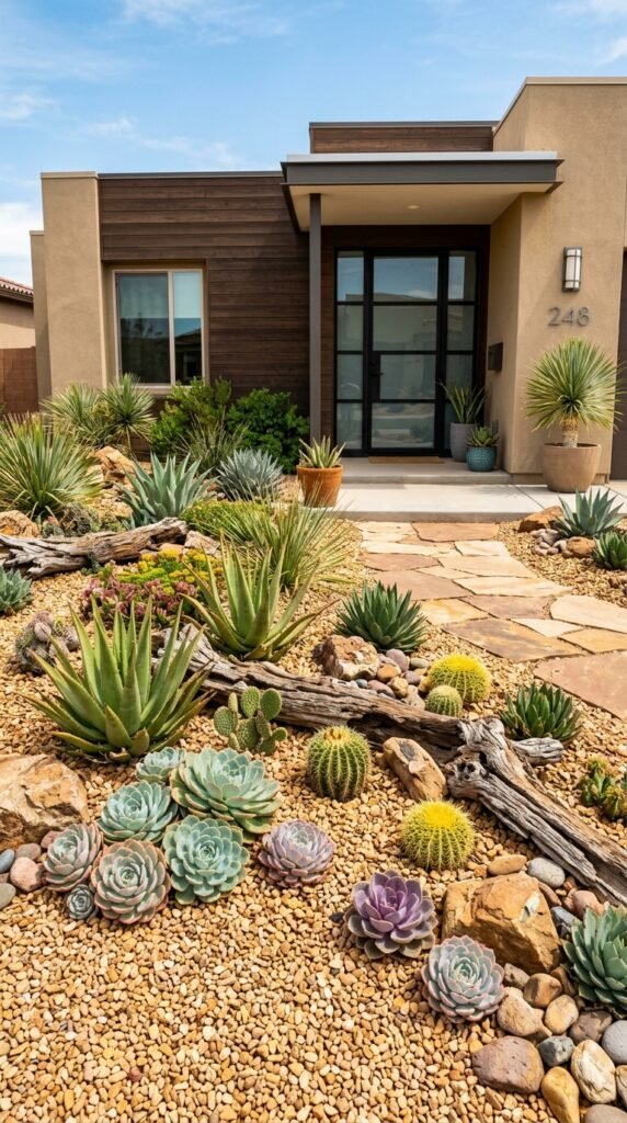 Layer warm toned rocks like sandstone or reddish gravel. Then mix in succulents such as aloe, echeveria, and cactus varieties in different heights. Add a few driftwood pieces for that organic touch. Space everything out so each plant stands out.