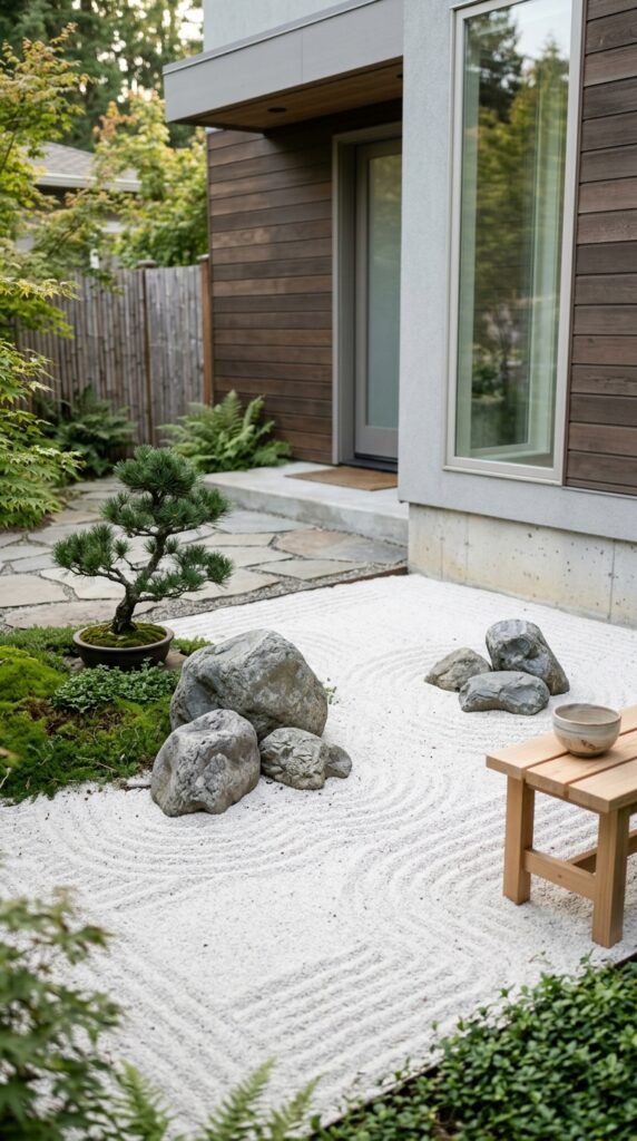 If you love clean lines and calm vibes, this one is your aesthetic soulmate. A minimalist rock garden uses neutral gravel, large sculptural boulders, and carefully spaced plants to create that magazine worthy look.