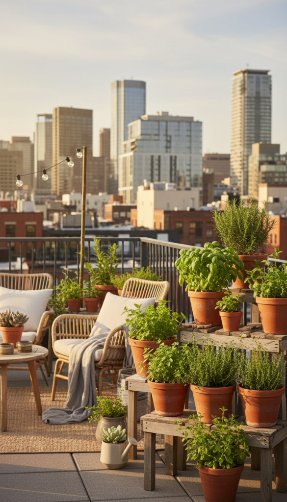 Herb corners bring life and practicality together. Fresh basil or mint within reach makes rooftop gardening feel rewarding, not just decorative. Plus, herbs smell amazing in warm evening air.