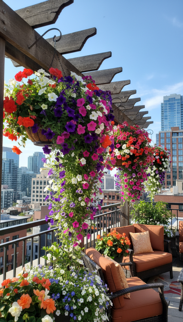 Hanging baskets add color without stealing floor space. Perfect for rooftops where every inch counts. Plus, flowers at eye level feel cheerful instantly.