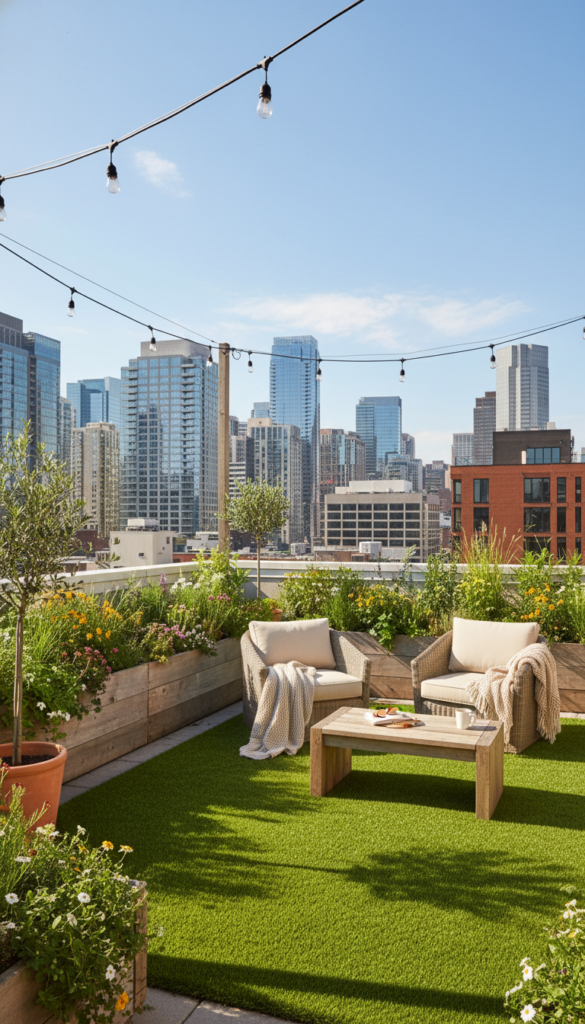 A small artificial or natural grass patch softens the whole rooftop instantly. Hard surfaces dominate rooftops, so greenery underfoot changes the mood fast.