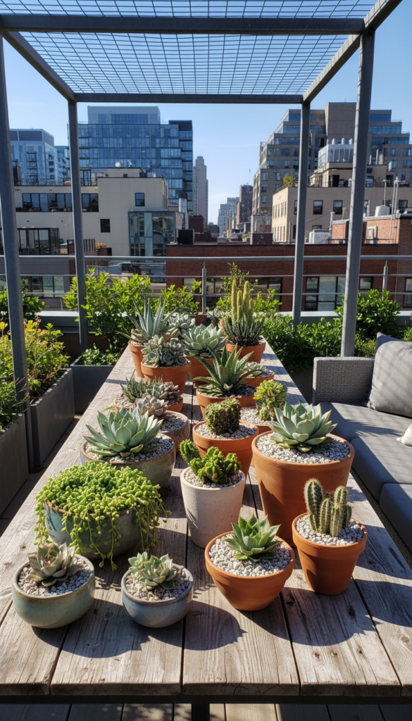 Succulents make rooftop gardening almost foolproof. They tolerate heat, require little water, and look sculptural. Perfect if your schedule stays unpredictable.