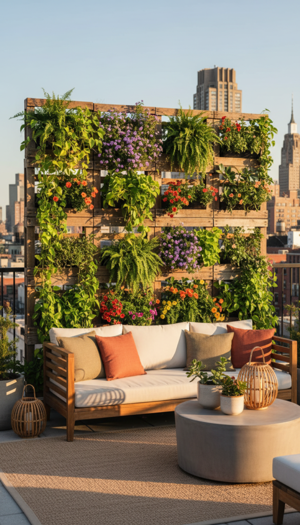 A vertical plant wall instantly makes a rooftop feel lush without eating floor space. It works perfectly for small garden decor because you grow upward instead of outward. And honestly, a bare wall begs for greenery.