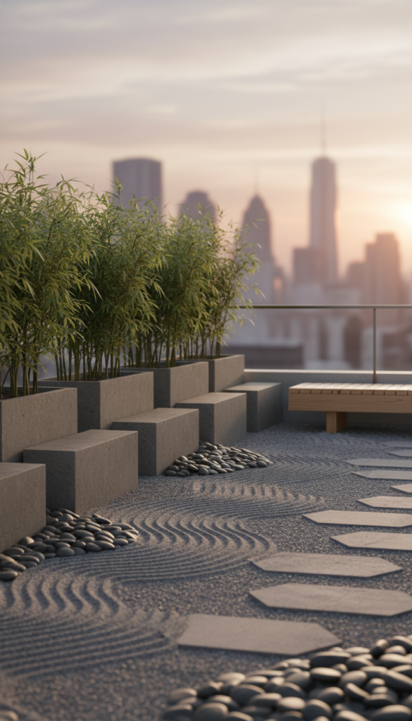 Use planters with dwarf bamboo or ornamental grasses. Pair with stone textures, simple benches, and neutral tones. Keep decor minimal to maintain that Zen feel.