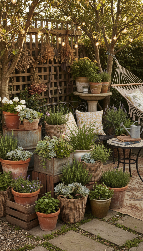 Combine ceramic, terracotta, and stone planters in clusters. Vary heights to keep the eye moving and avoid perfect symmetry.