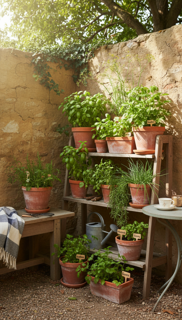 Group terracotta pots together with basil, rosemary, and mint. Keep them near seating areas so the scent hits when you brush past.