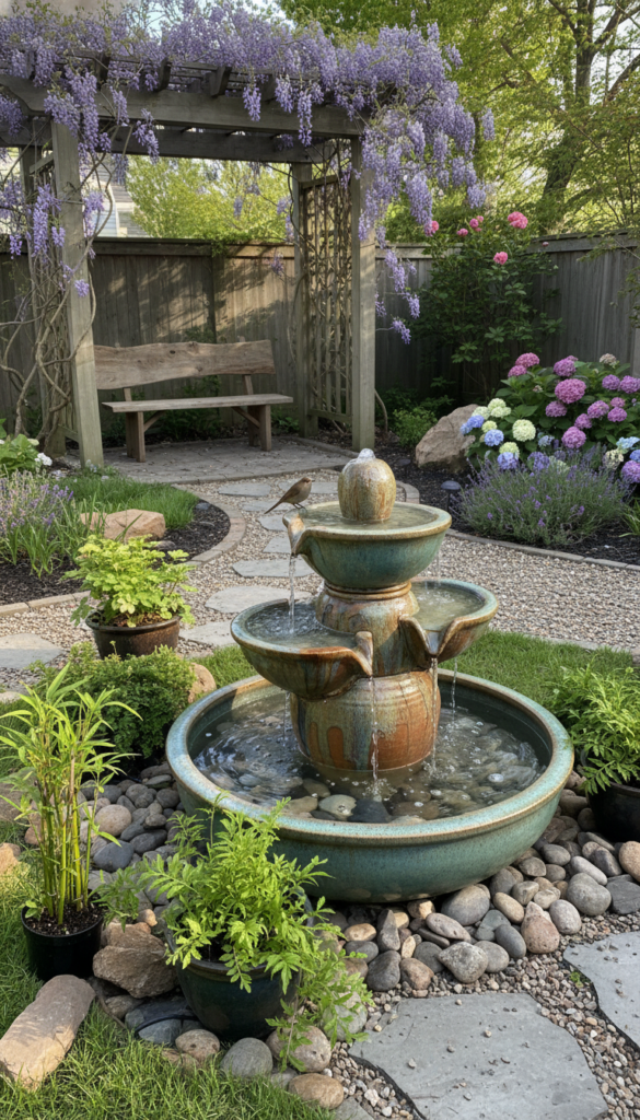 You do not need a full pond to get calming water sounds. Small water features add movement and tranquility.
