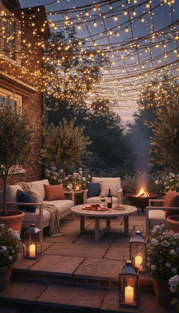 Lighting changes everything. String lights create instant atmosphere and make any backyard feel inviting once the sun goes down. A canopy effect feels especially dreamy.