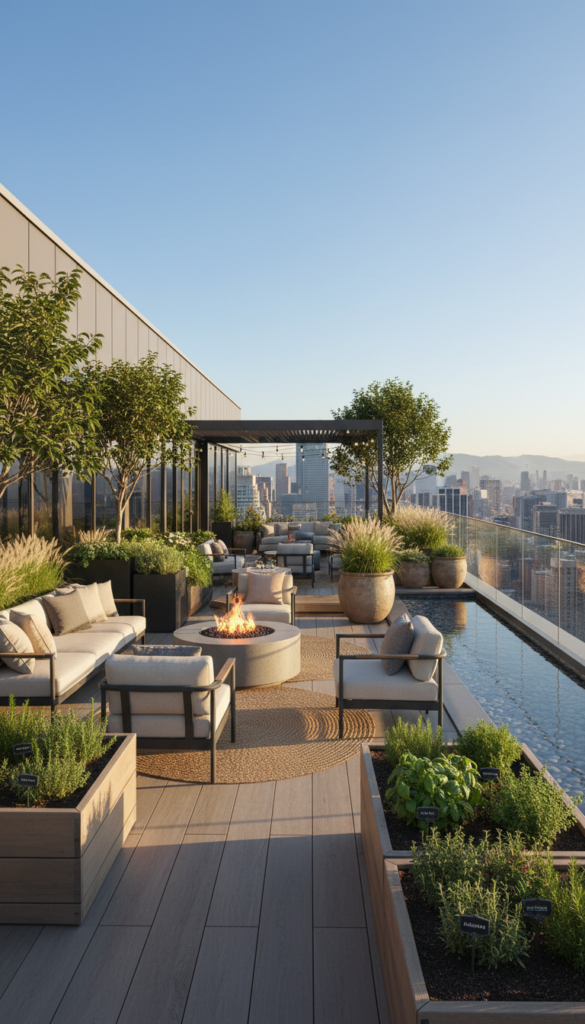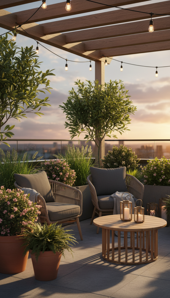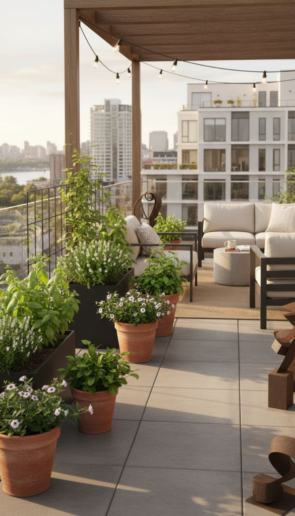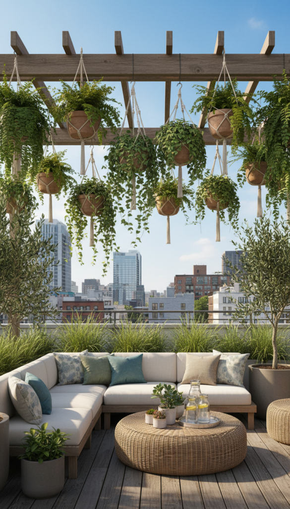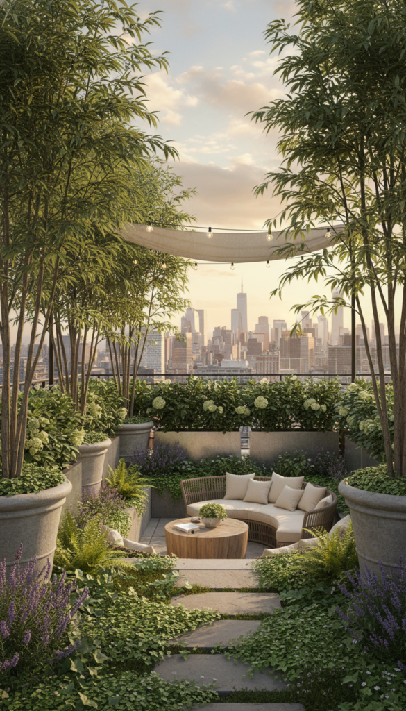 Layer foliage heights for better coverage and shade. Designers often use greenery instead of walls because plants soften urban rooftops visually.