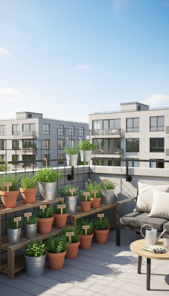 Label pots neatly for aesthetic value. Mint, basil, coriander, and thyme thrive easily on rooftops with proper sunlight and drainage.